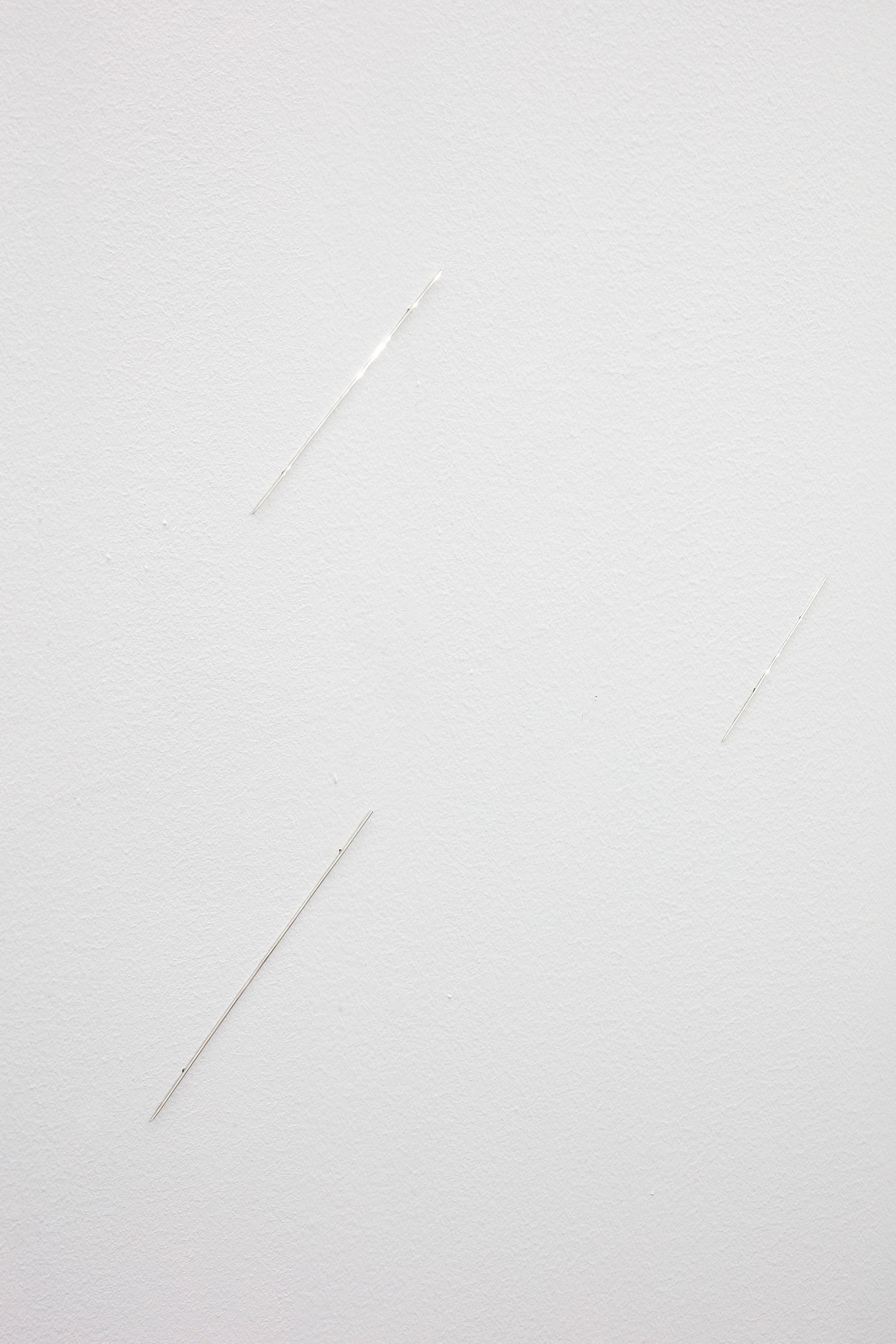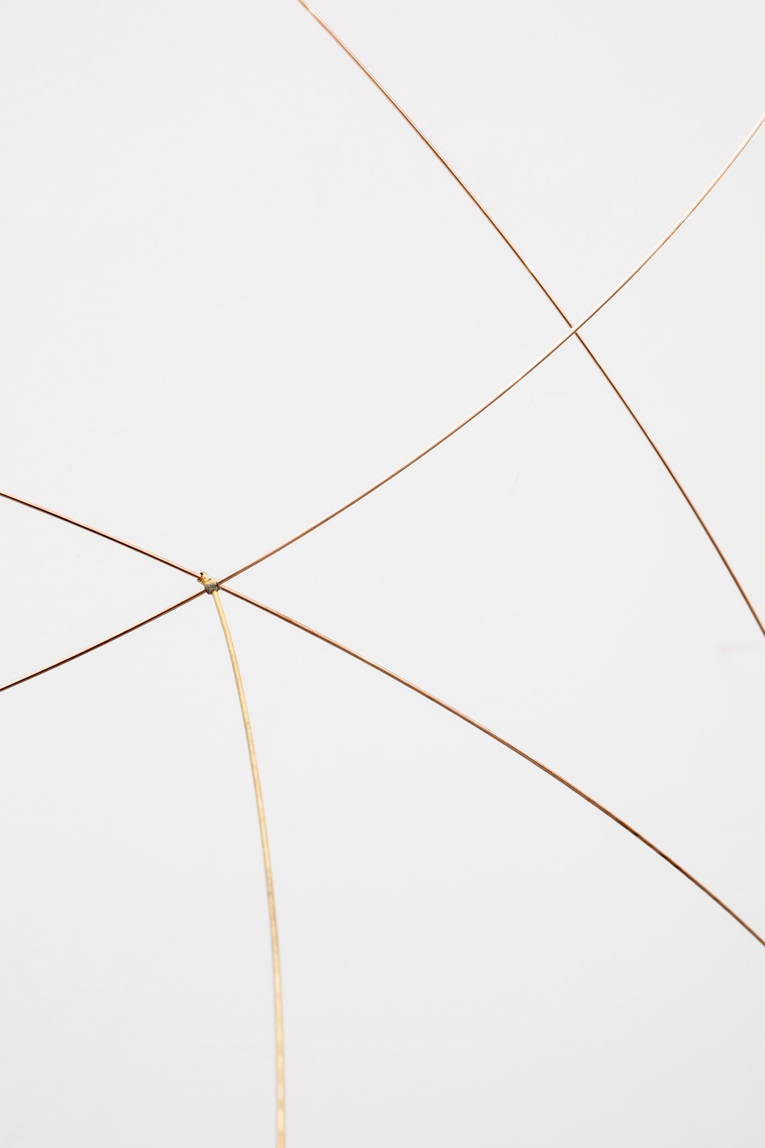 The forms of her sculptural works, which recall natural elements – the rain, the sun, the stars and sound waves – bend and reshape themselves, under their own gentle weight, and they react, vibrating, to their specific ambient conditions like the jagged landscape of a lightning-filled sky, or moonscapes in which any human presence is barely perceptible.