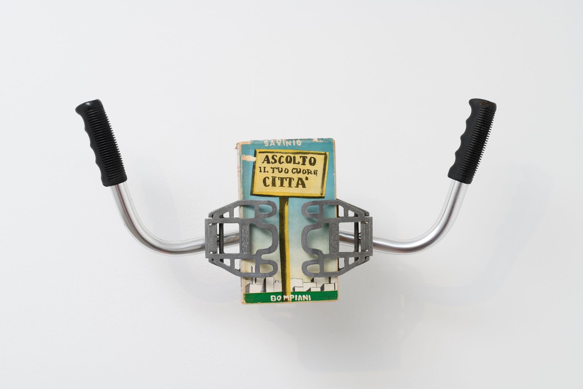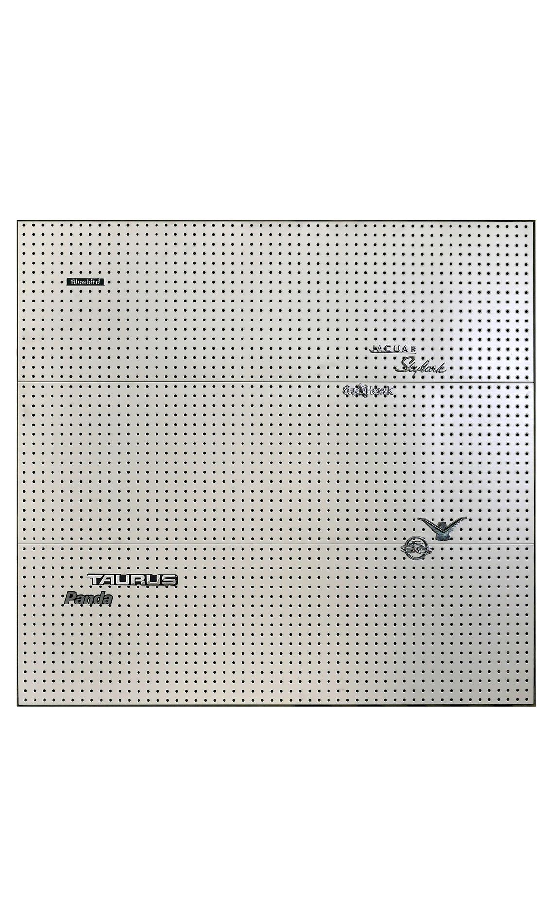 Car emblems, steel and enamel on perforated galvanized steel panels