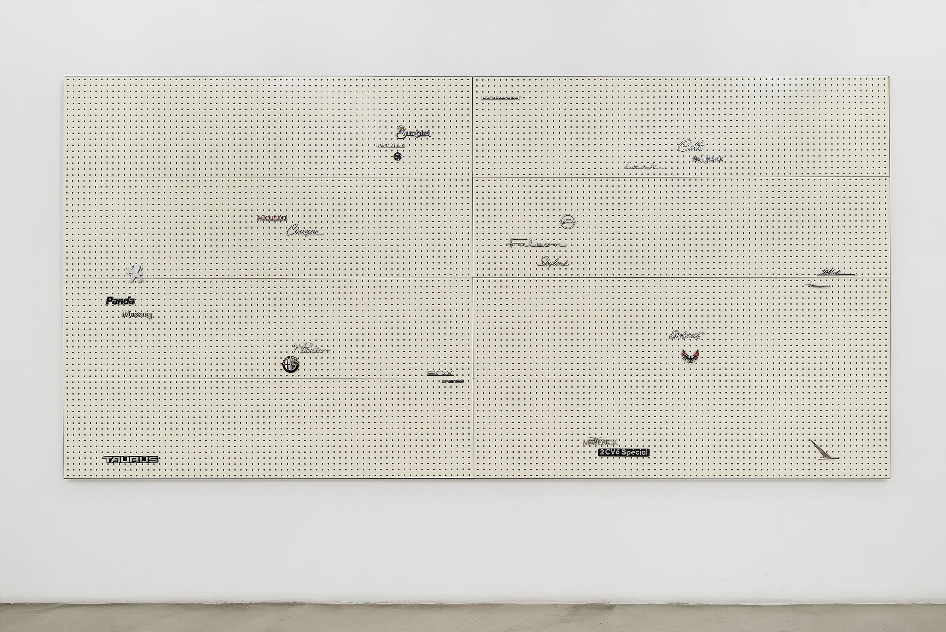 Car emblems, steel and enamel on perforated galvanized steel panels