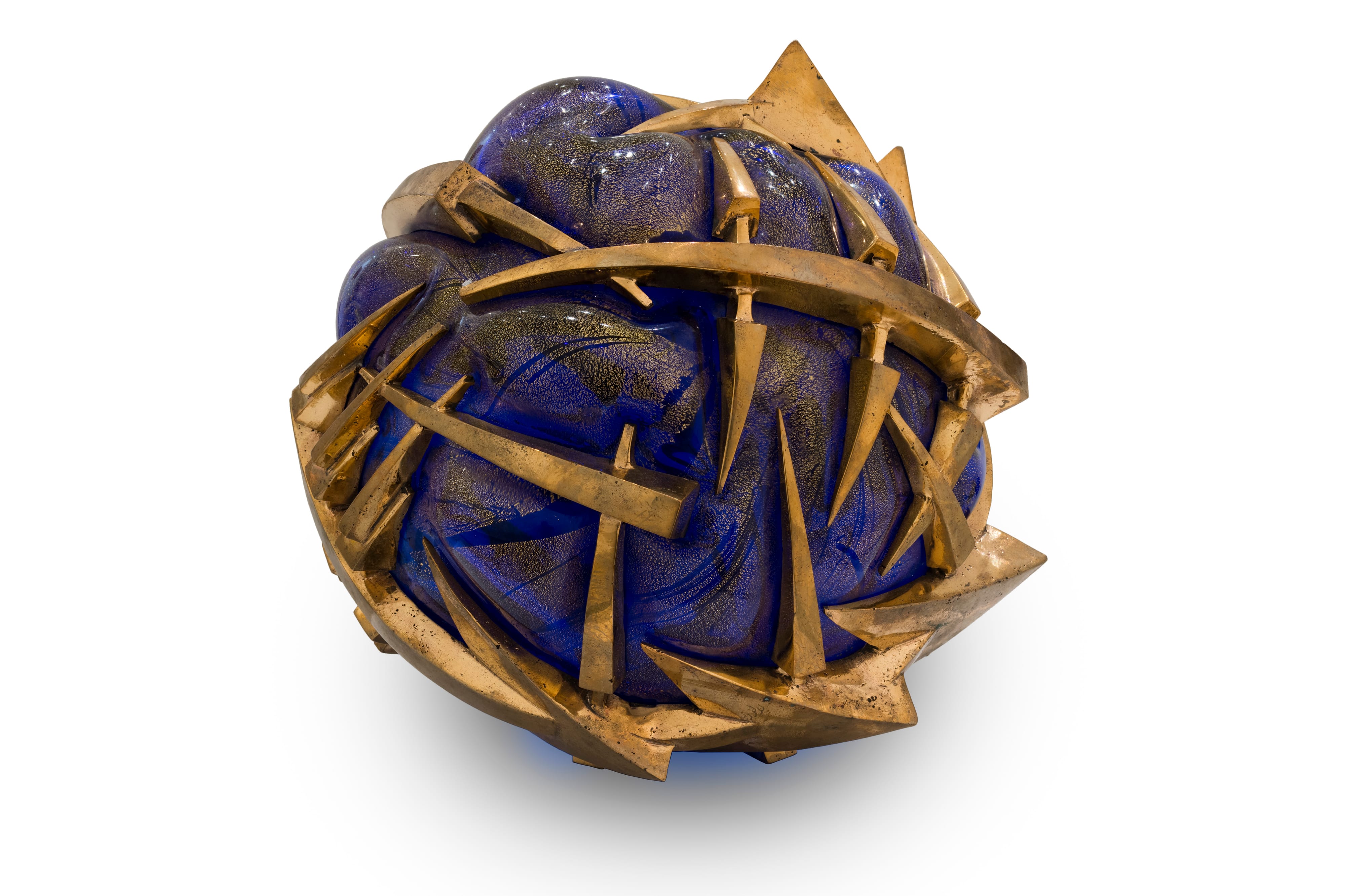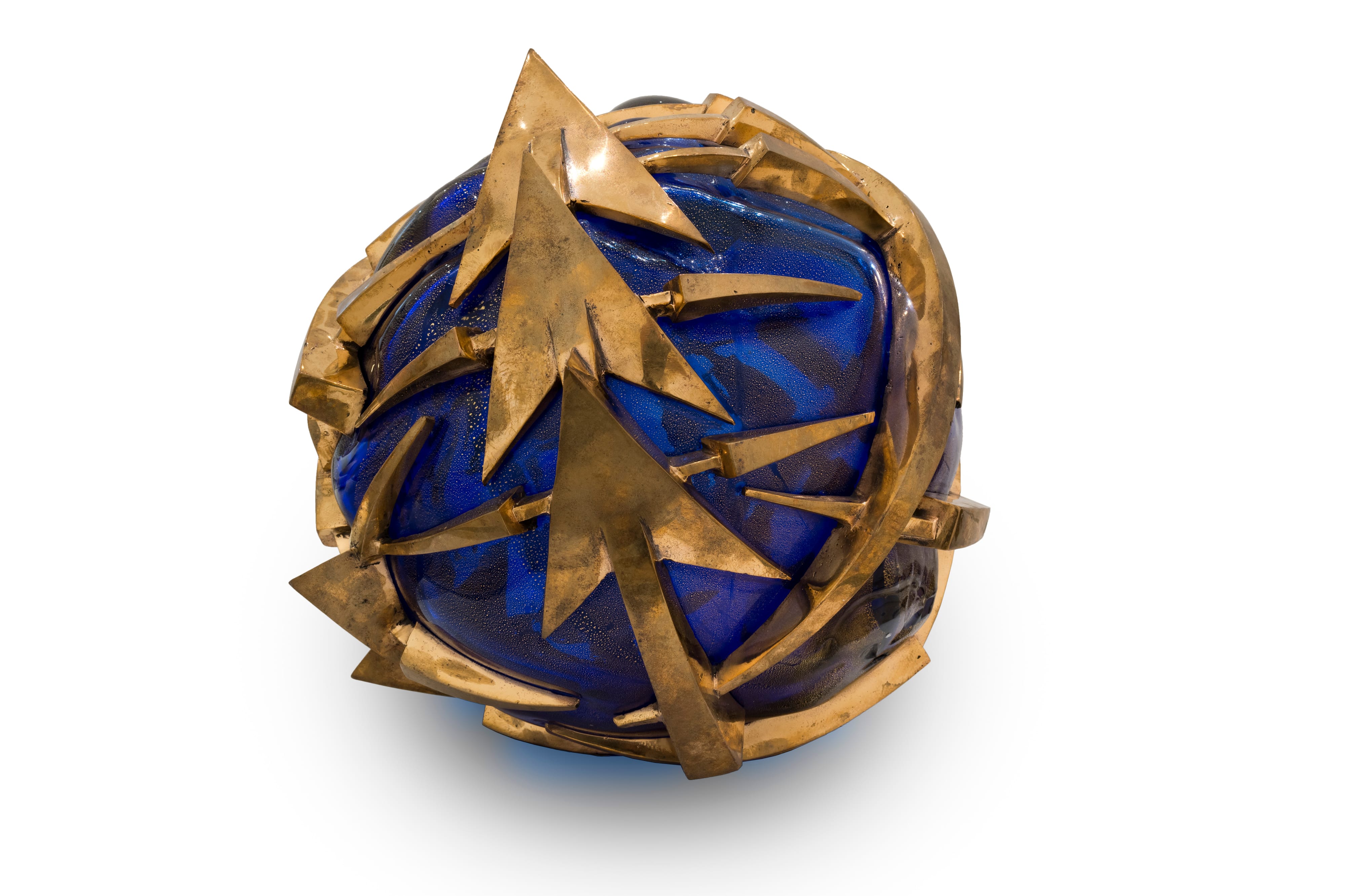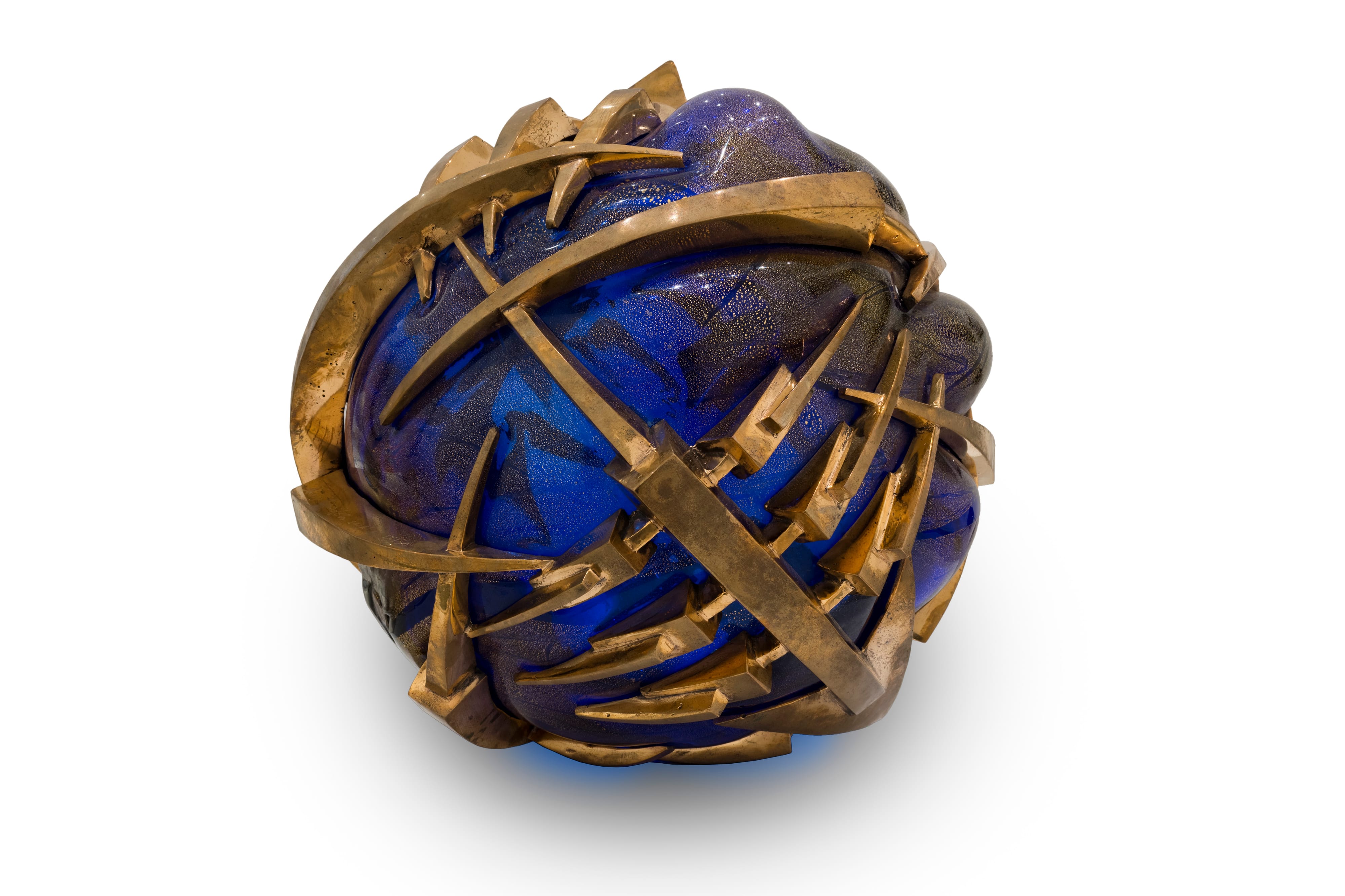 bronzo e vetro lavorato a mano e soffiato a bocca in colore blu e oro graffiato