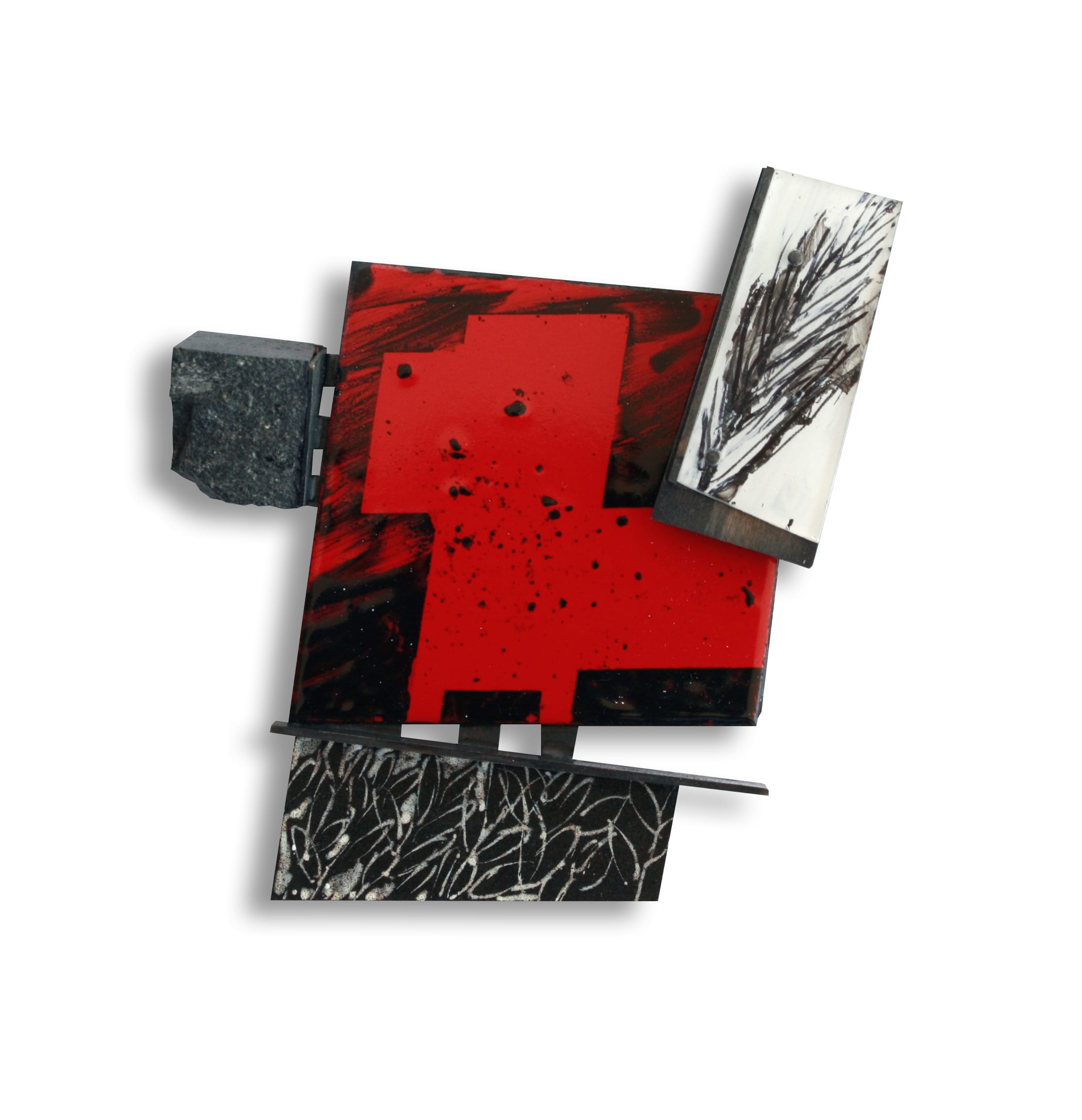 TechniqueOxidized nickel silver, enamel on steel, basalt, perspex and acrylic painting.