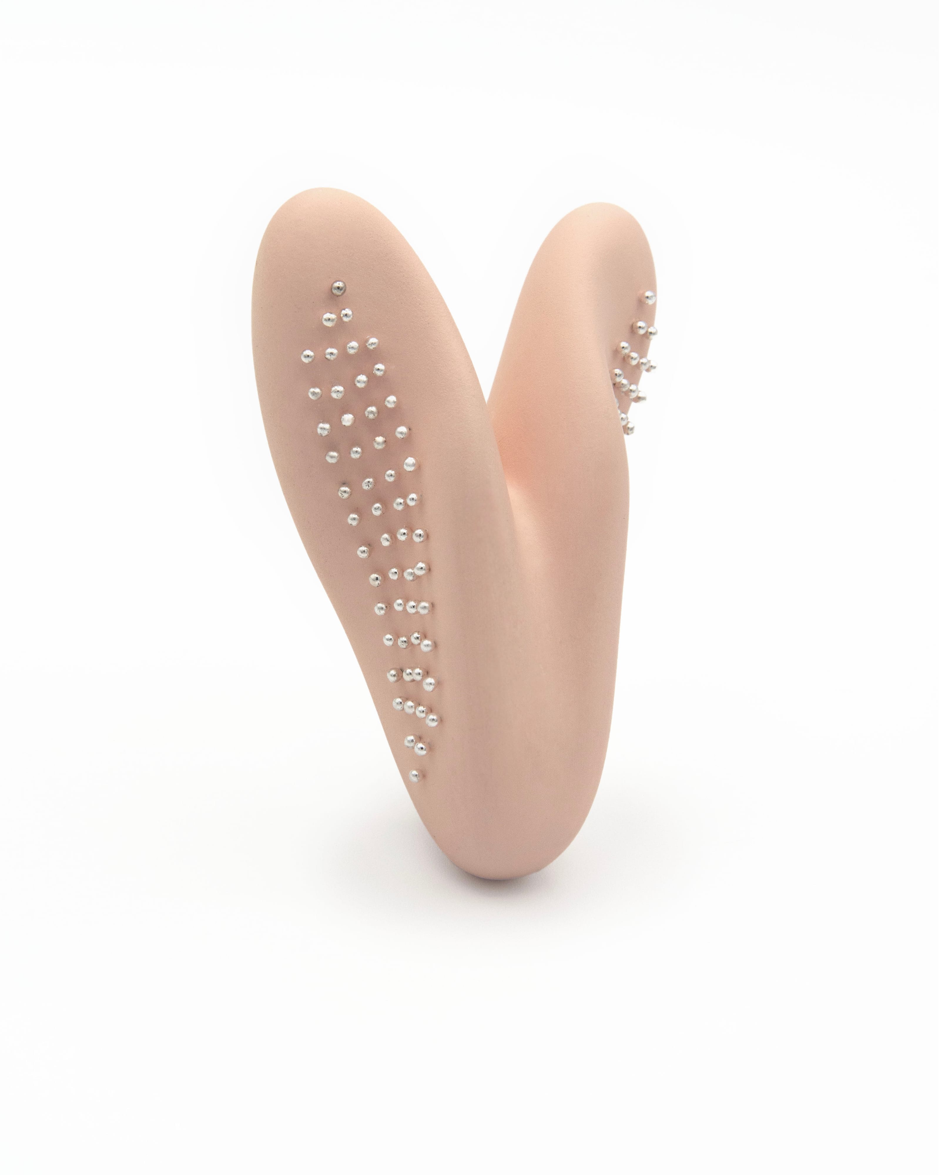 The Hold Me series explores vulnerability as an act of risk, exposure, and partial surrender of autonomy. The human body's inherent fragility is essential to inter-corporeal relationships, as the body mediates between what is internal, hidden, and subjective and what is external, explicit, and observable. This negotiation is necessary yet complex, often fraught with conflict. The pieces in this series materialise a reflection on how, in specific contexts and relationships, the mind and body become trapped in ingrained “postures”—deeply rooted patterns that generate discomfort yet remain challenging to escape. The resin forms, moulded to follow the body's contours, invite touch: they embrace the curves of the neck, hands, fingers, collarbones, and knees. At the same time, the metal elements embedded in the smooth surfaces create an opposing tension—micro-spheres, small cones, and fine wires repel the touch, making contact uncomfortable, even unpleasant. Holding these objects is a voluntary yet often painful act. This gesture reflects the intricate relationship between vulnerability and resistance, the longing for connection and the need for protection.