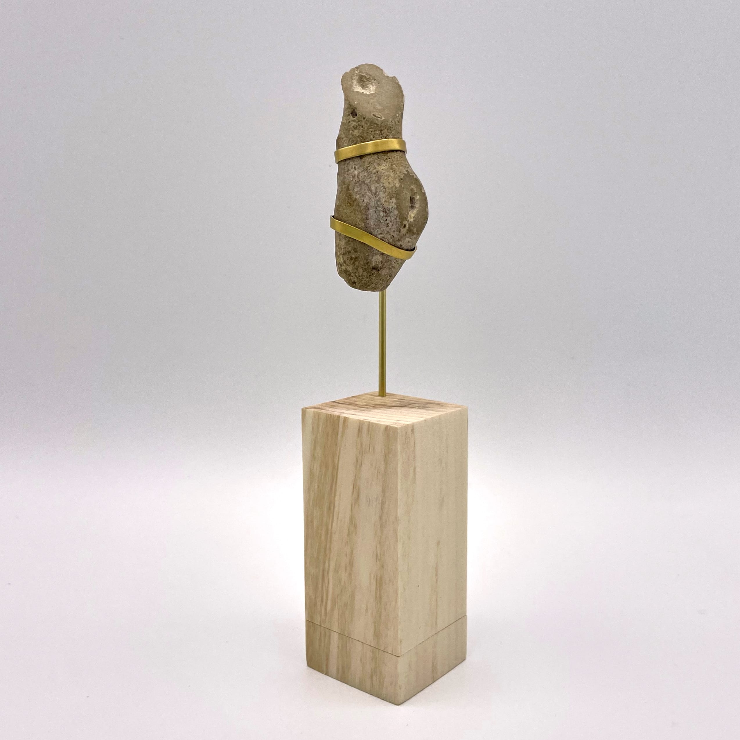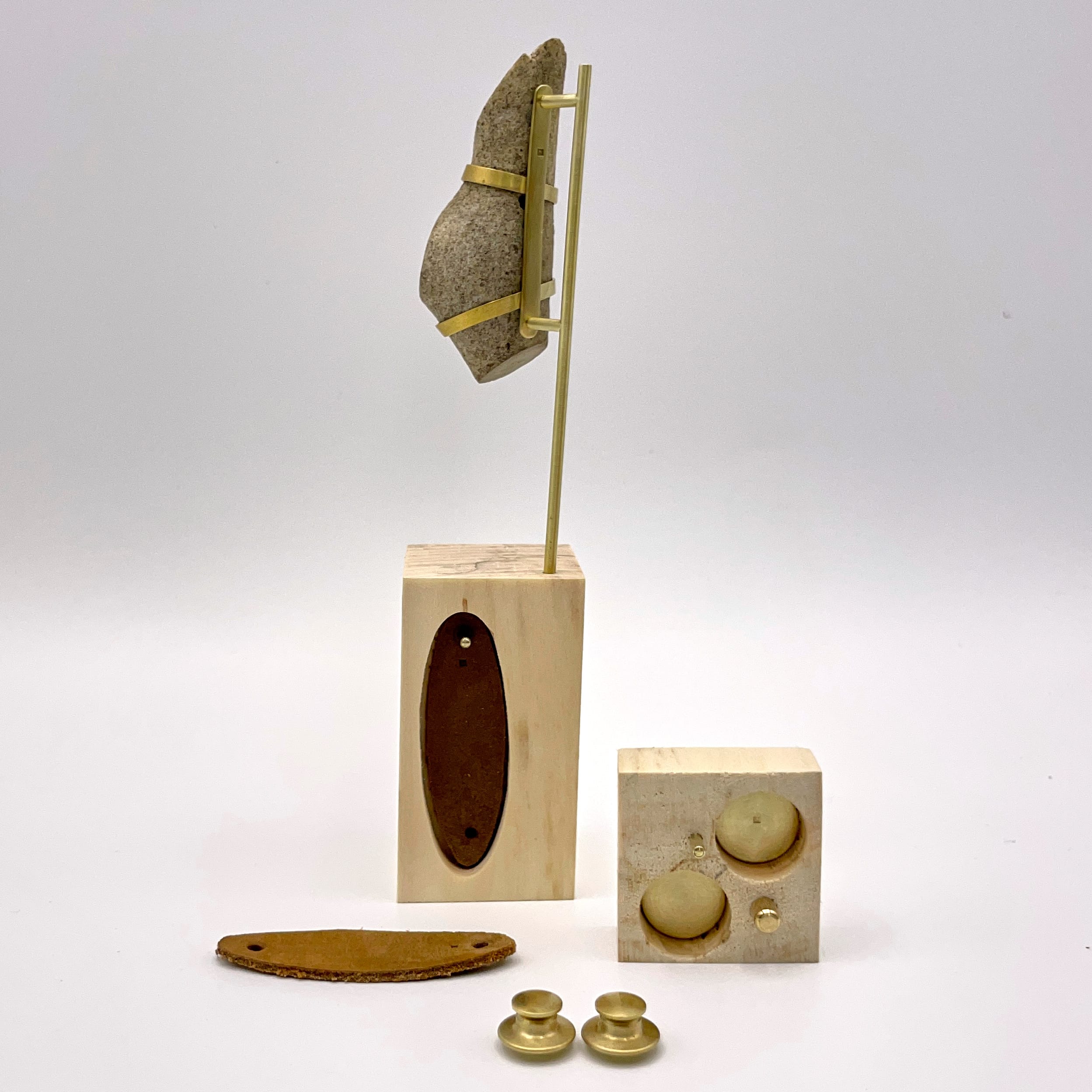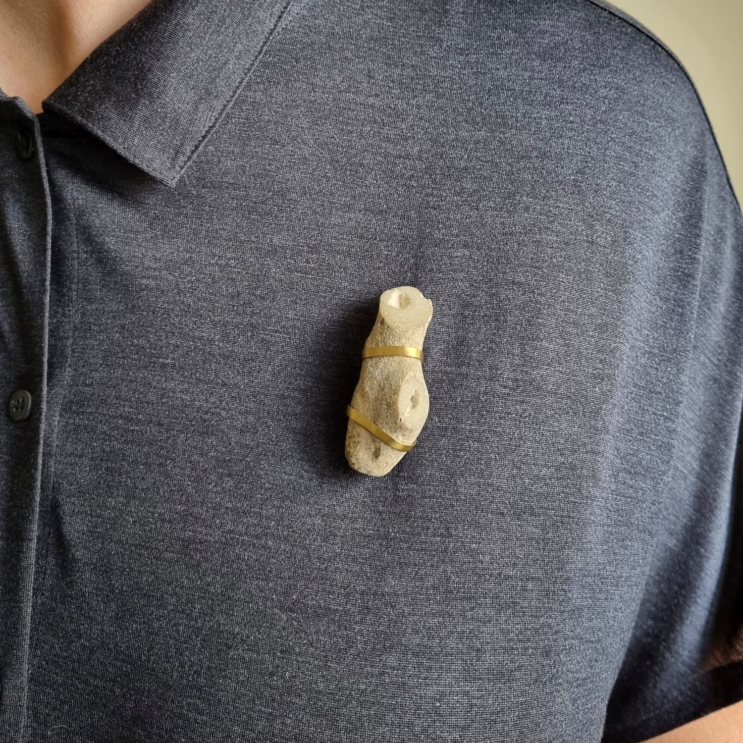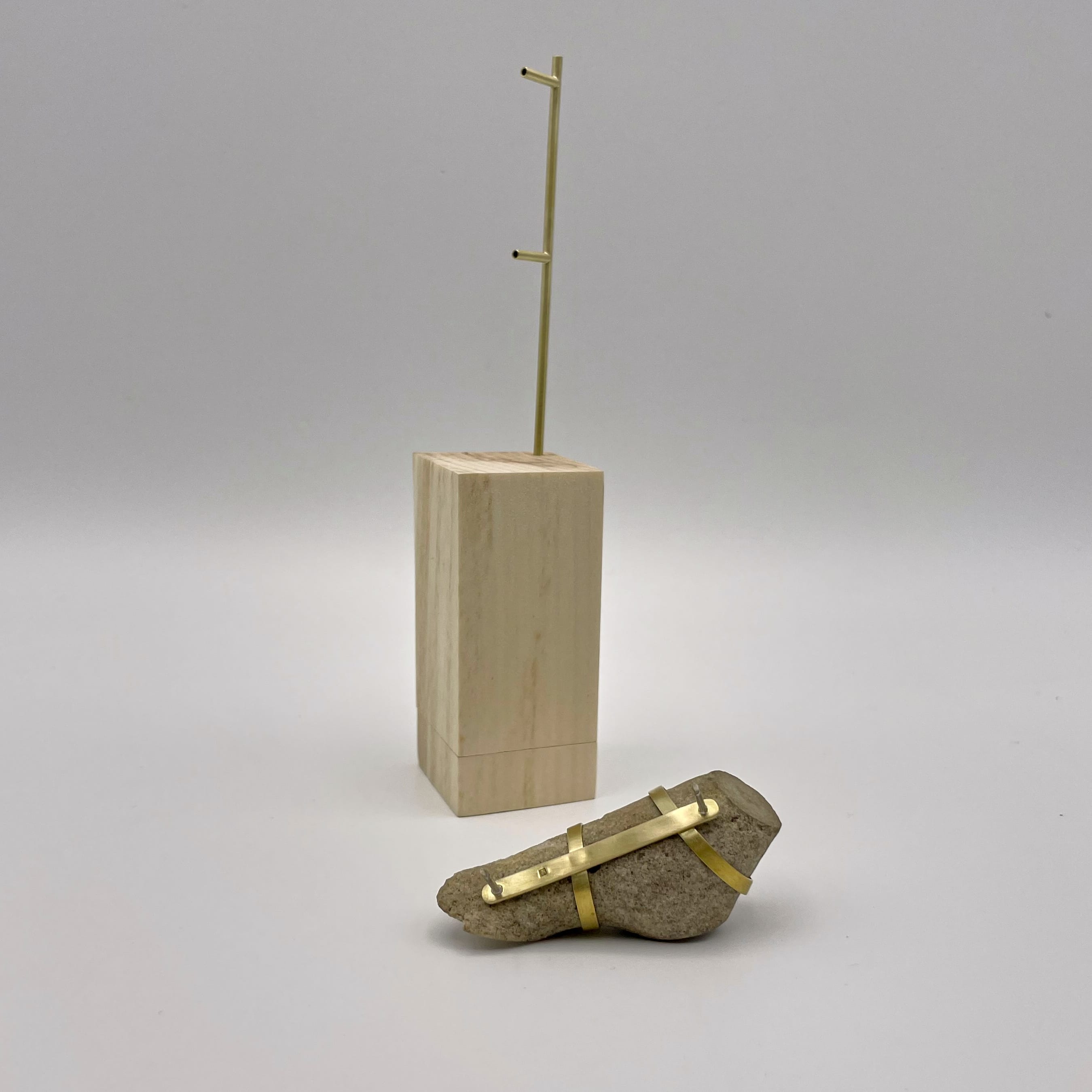 Tecnicaspilla / brooch, selce, ottone, fermacravatta in acciaio, legno di abete rosso, pelle | flint, brass, steel tie tack, spruce wood, leather