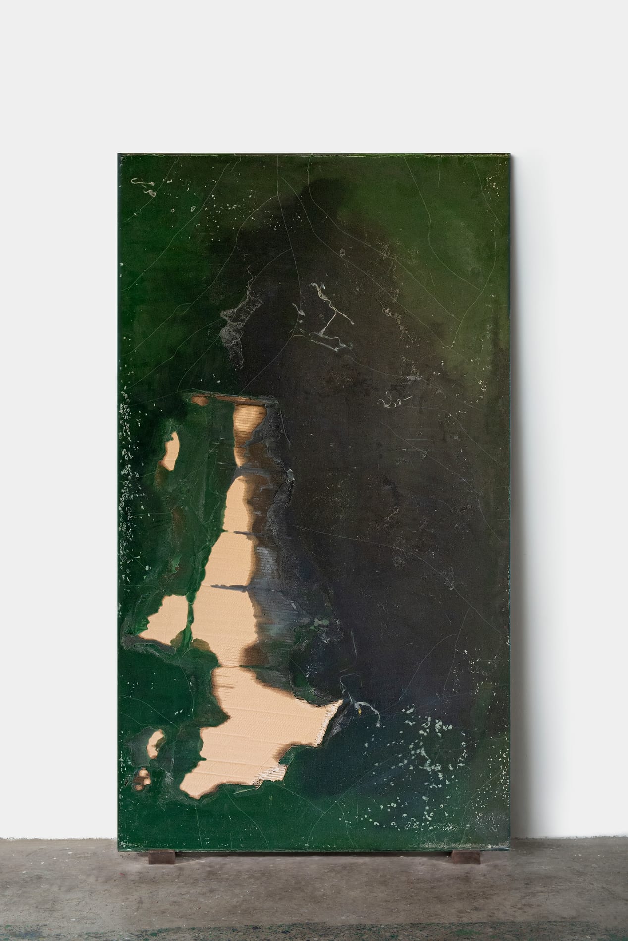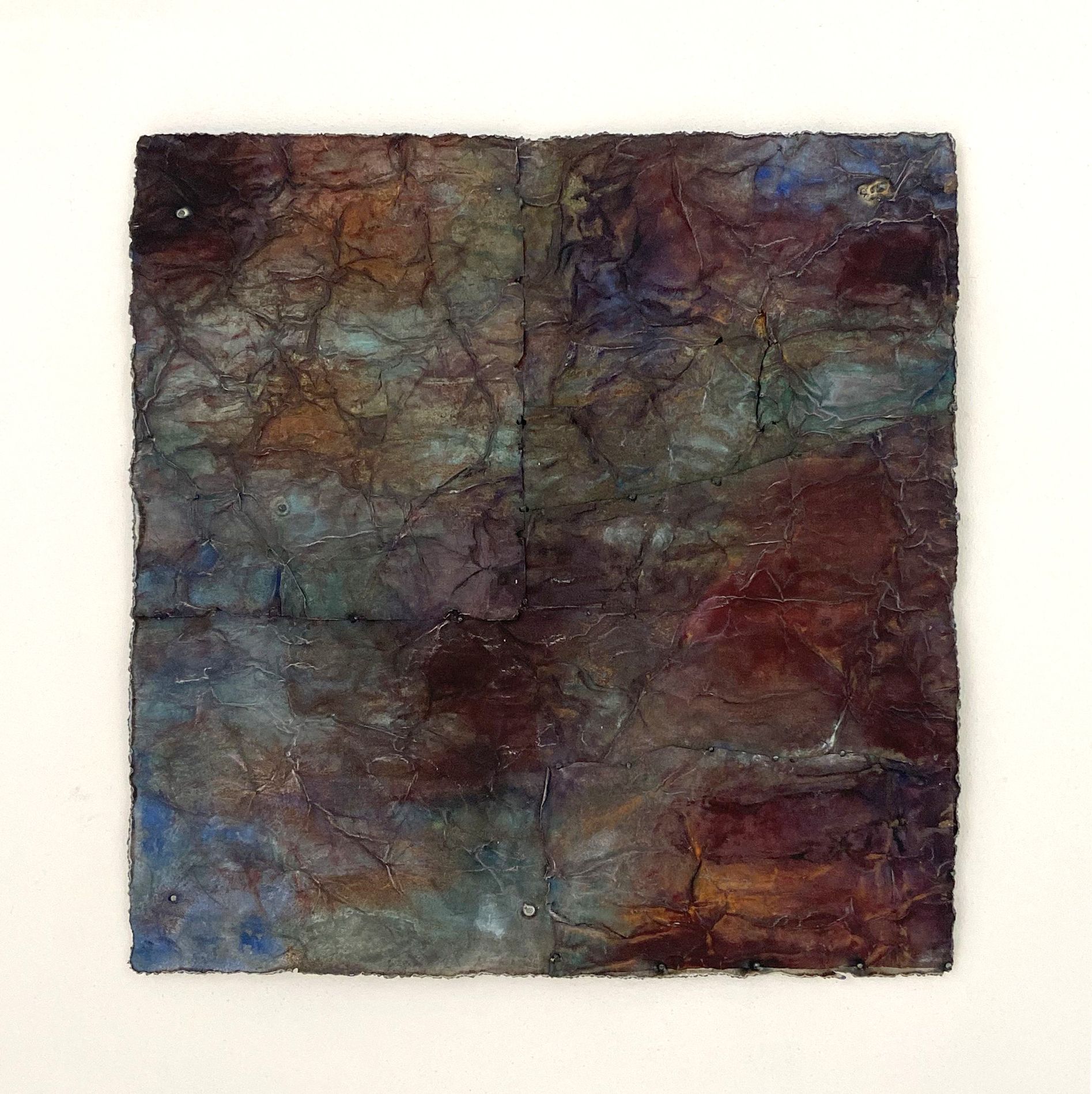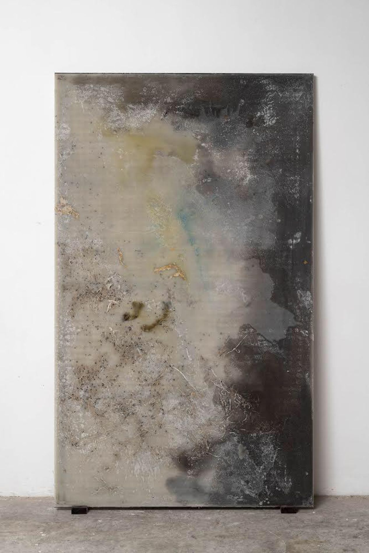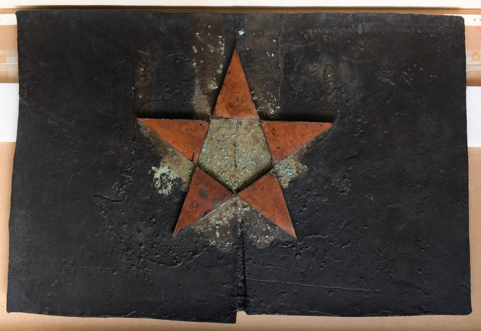 Pelle, petrolio, sabbia, polveri metalliche e solfato di rame su legno
