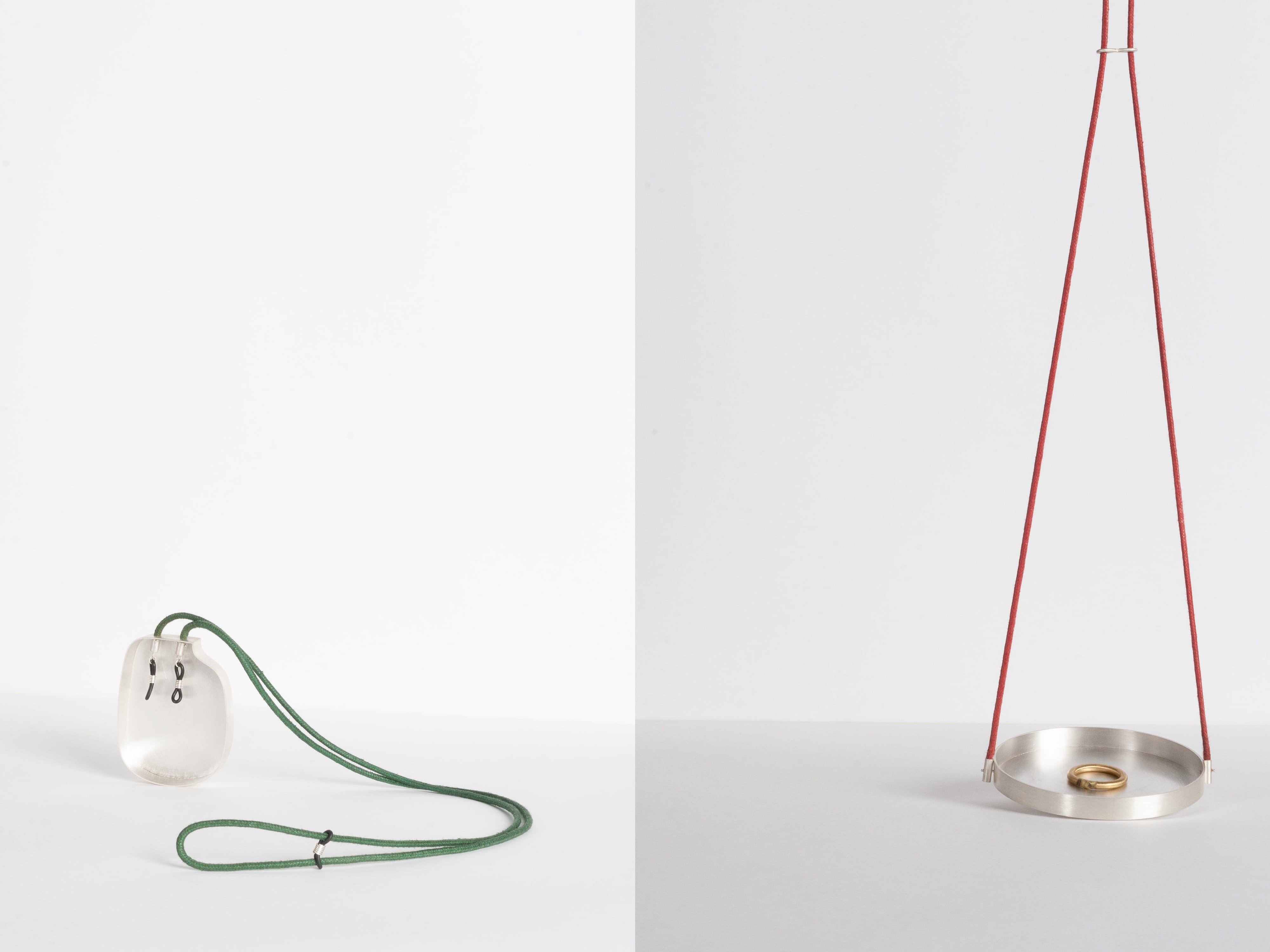 The pendant and ring set explores the concept of value and subverts traditional norms by using silver to create a measuring scale - an object typically made from base metal to weigh precious items - and a wedding band crafted in brass instead of gold.