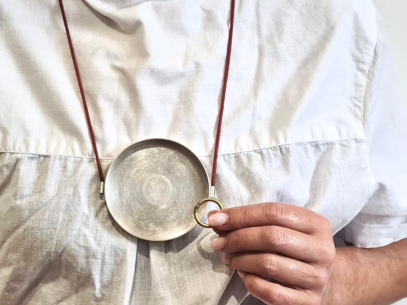 Materials: Sterling silver, cotton cord, brass