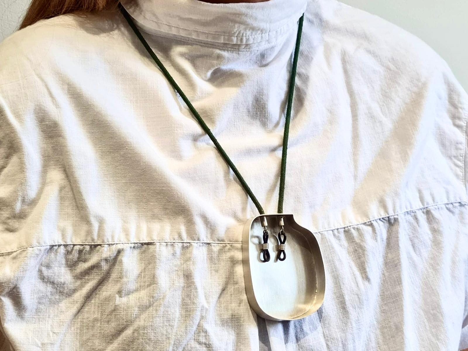 An empty case for glasses, once belonging to my grandfather, was the starting point of the collection. The empty space inside of it, became the inspiration for the concept of ‘filling the void' metaphorically and literally. I created a pendant alluding to an eyewear retainer's role in holding something important close at all times.