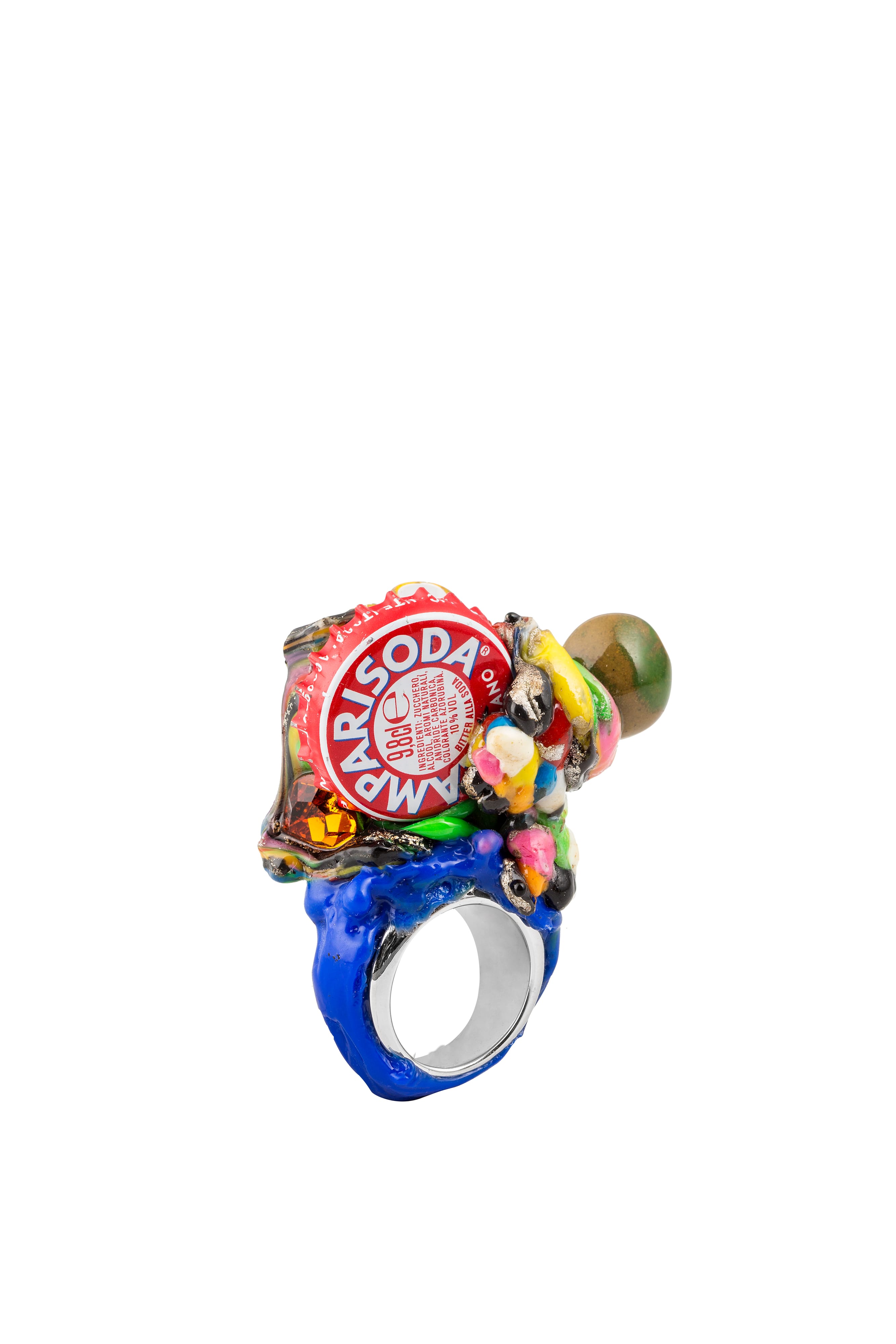 Uderzo's iconic collection BLOB-rings originated in 1992 and has undergone a process of increasing complexity and structuring; besides the attention to shapes and colours and the use of experimental techniques and materials in the manufacturing of plastics, the focus is on the creation of stories with a pop flavour.