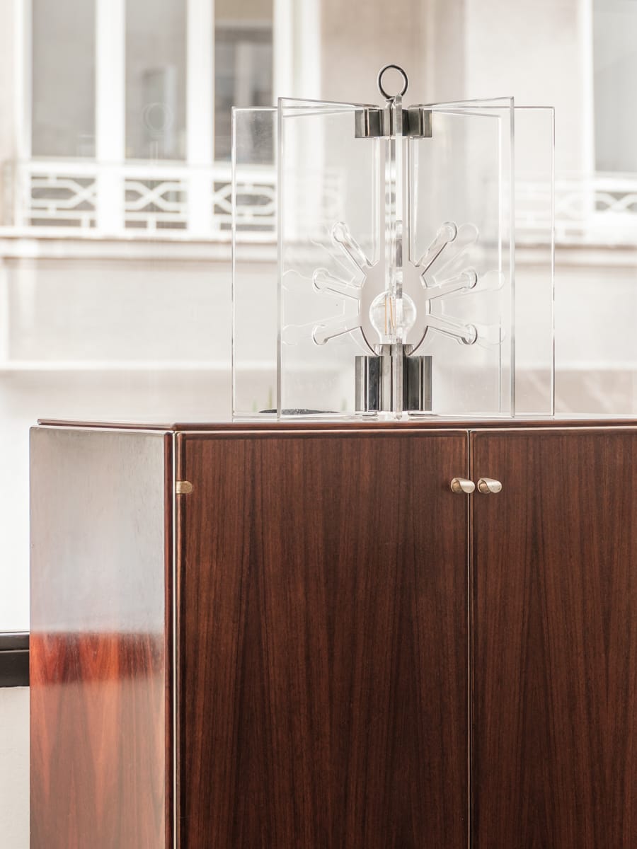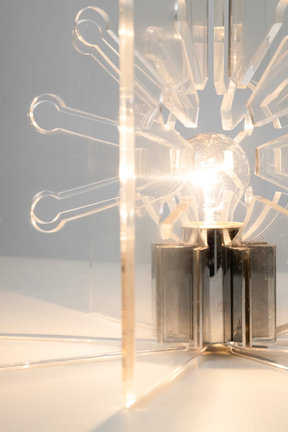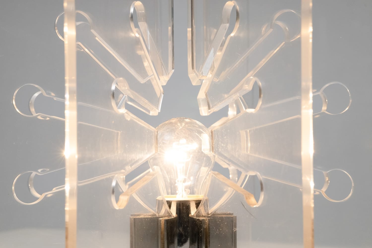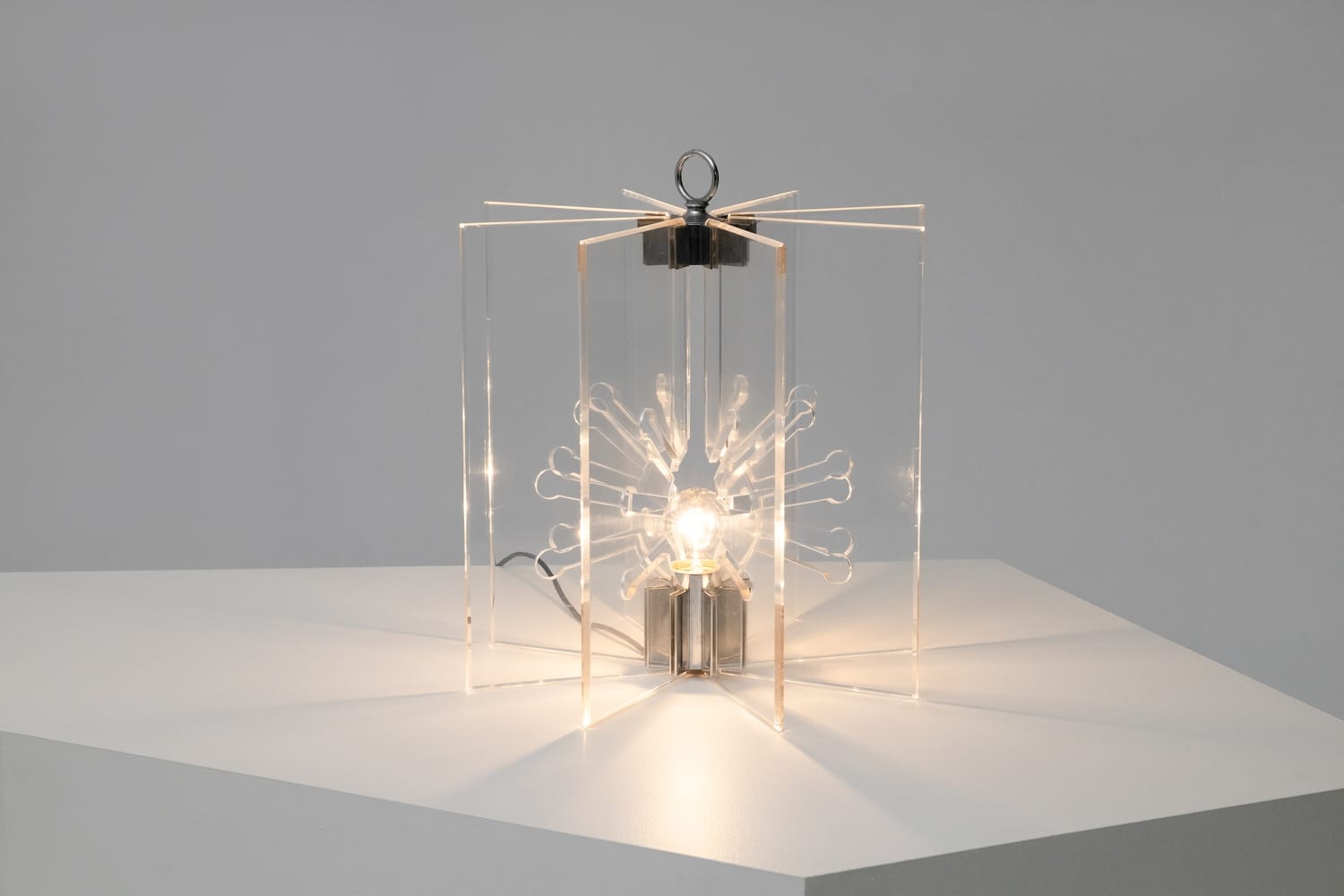 TechniqueChromed metal base and upper handle and eight transparent perspex sheets