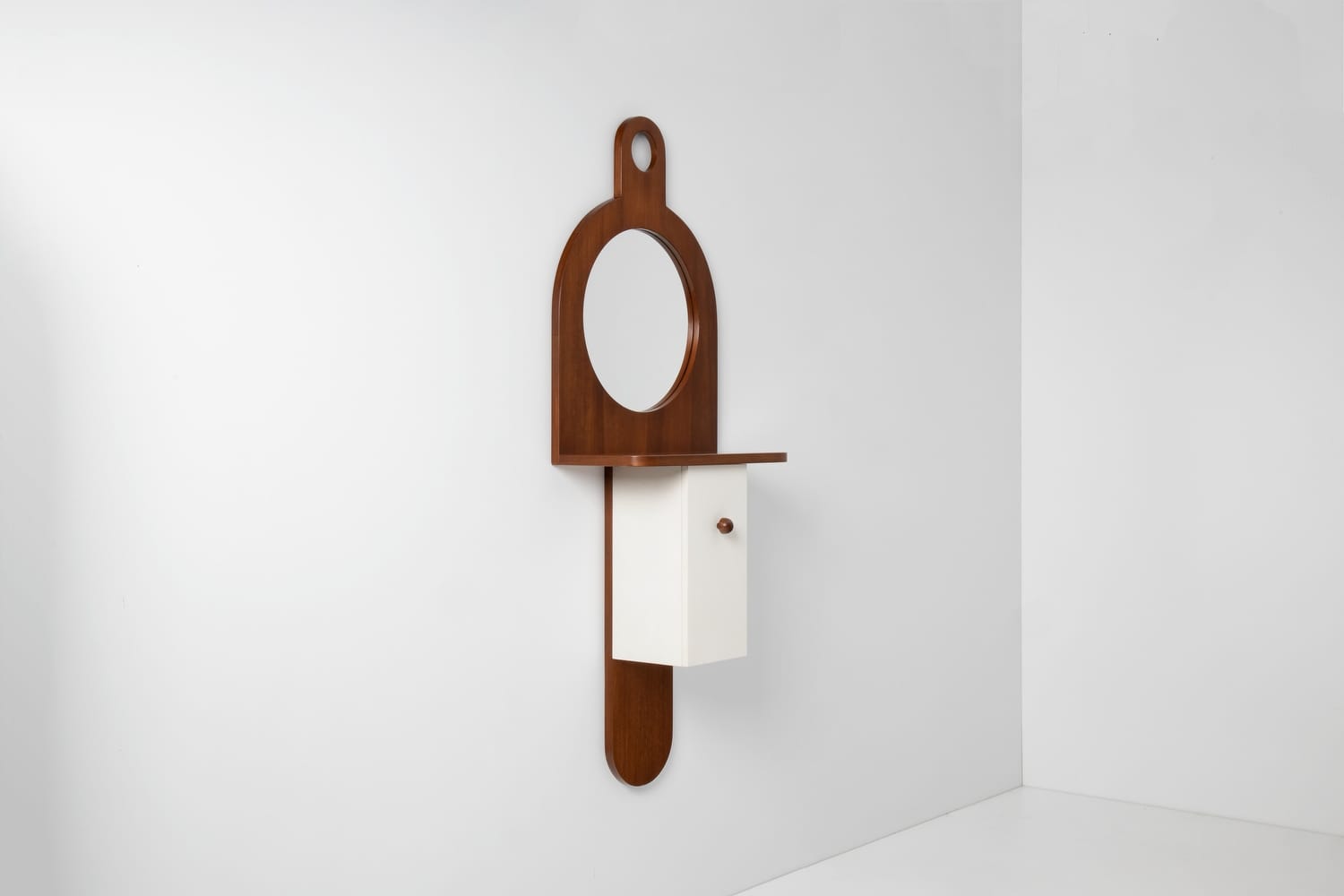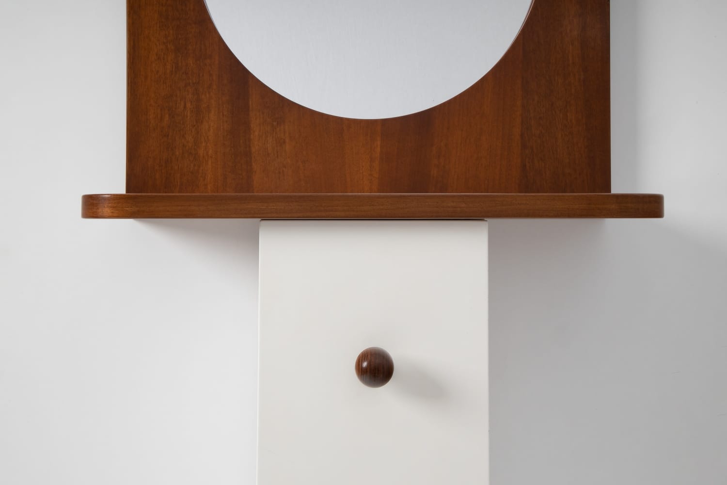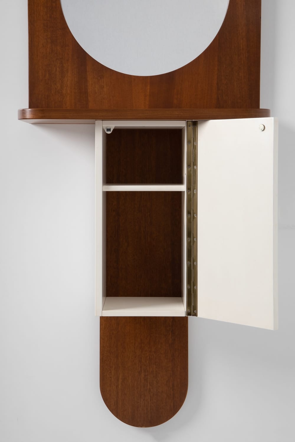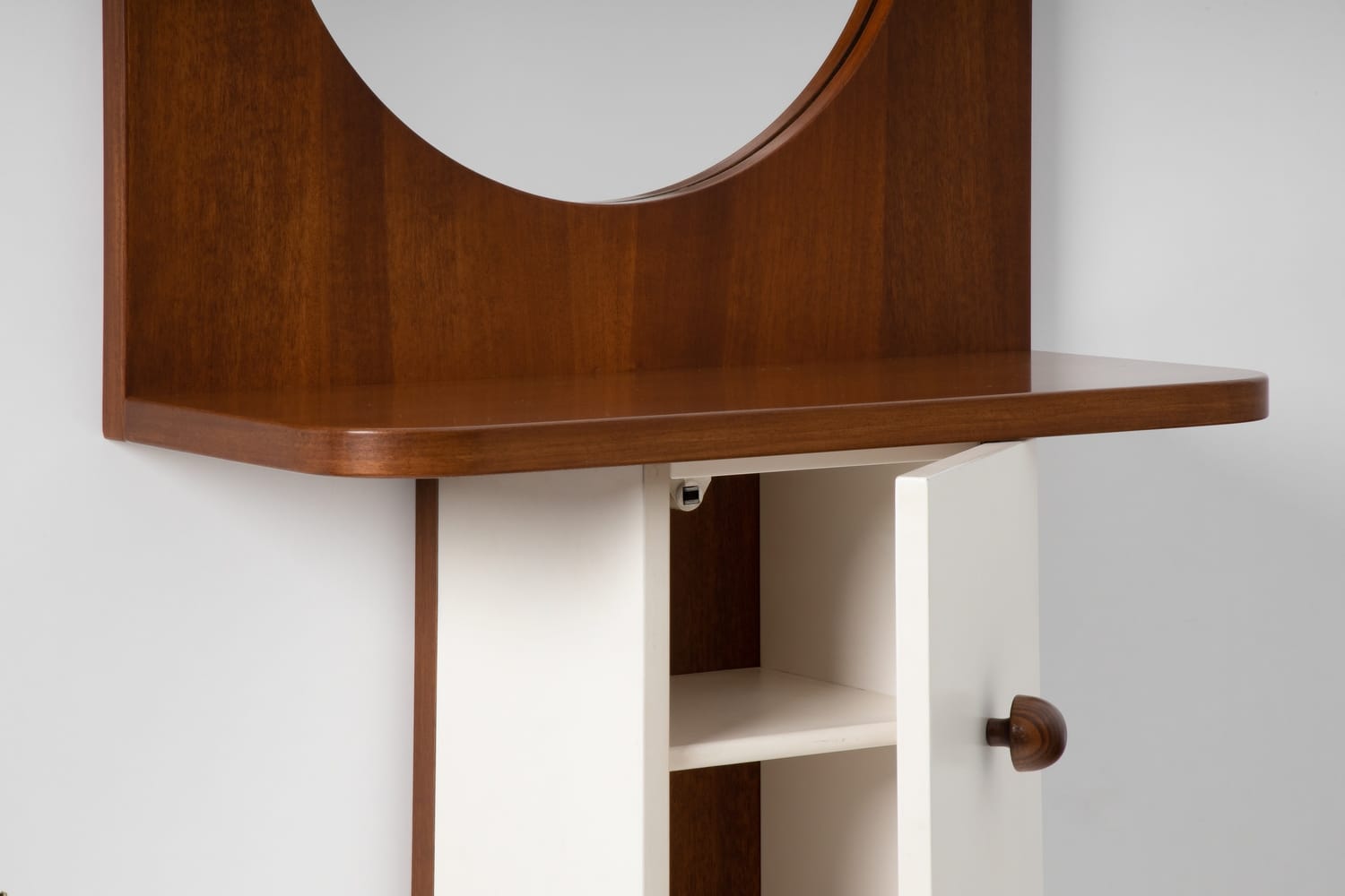 TechniqueWalnut veneer structure with white lacquered cupboard and original mirror and bottom cabinet with integrated storage